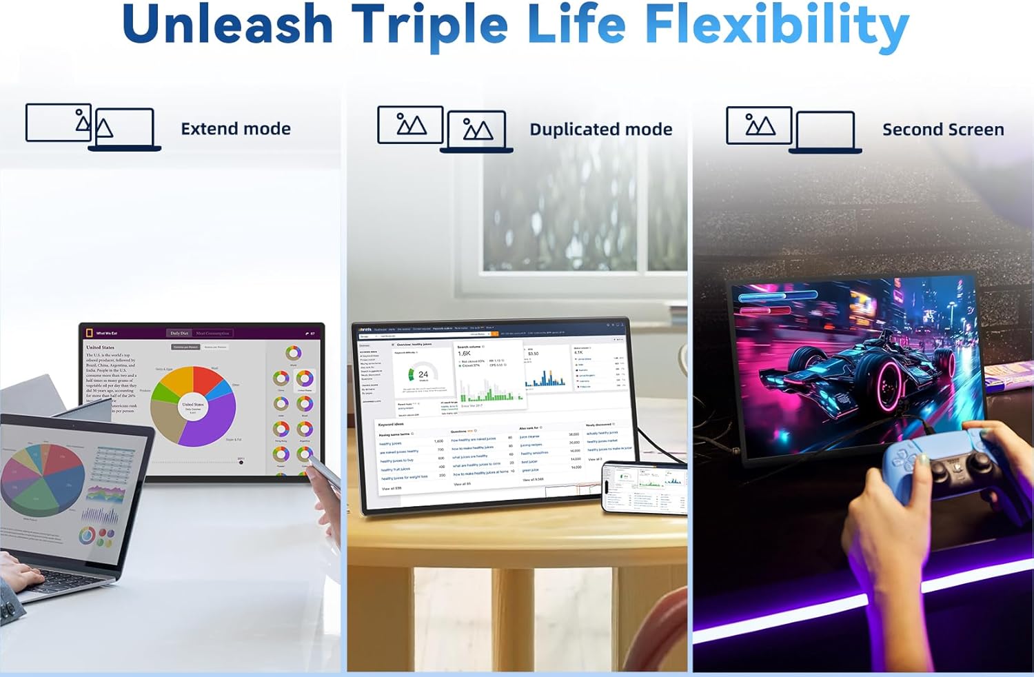 Cet écran d'ordinateur portable est doté d'un support inclinable jusqu'à 90° et rotatif à 360°, vous permettant de le positionner exactement comme vous le souhaitez. Grâce aux fentes latérales, vous pouvez facilement passer de l'orientation horizontale à l'orientation verticale, ce qui le rend idéal pour toutes vos applications, des feuilles de calcul aux réseaux sociaux. De plus, avec ses trois modes d'affichage (Dupliquer, Étendre et Second écran), vous pouvez personnaliser votre configuration selon vos besoins. Ce moniteur est votre fidèle partenaire. Nous offrons une garantie de 365 jours pour protéger votre utilisation.