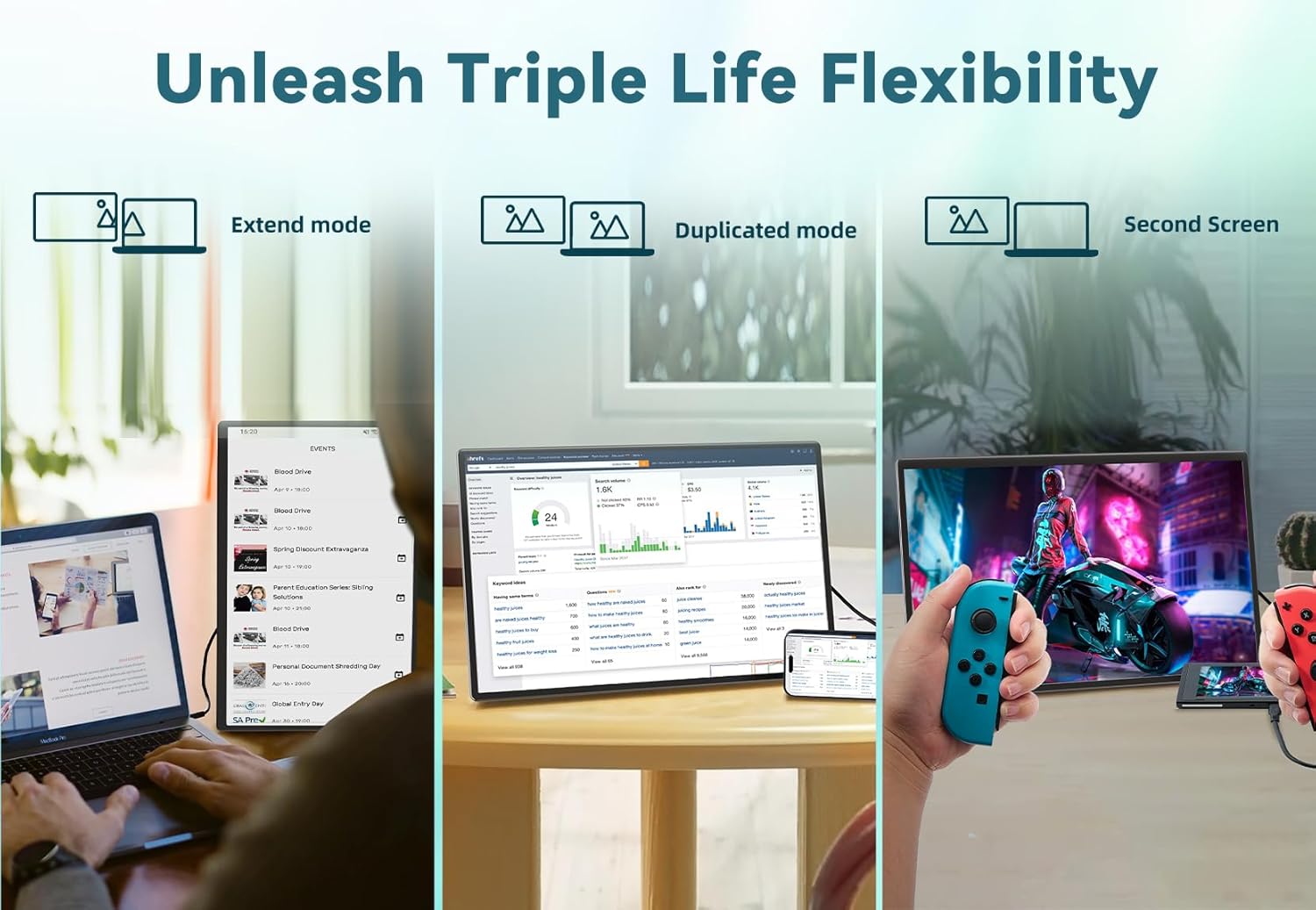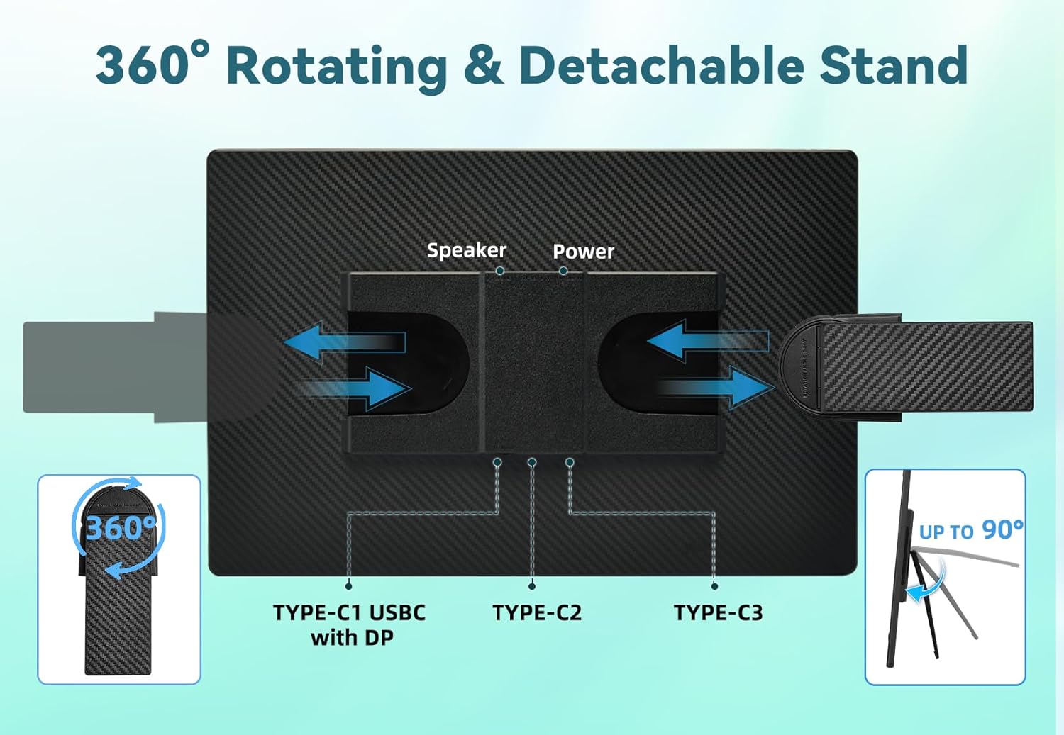 Cet écran d'ordinateur portable est doté d'un support inclinable jusqu'à 90° et rotatif à 360°, vous permettant de le positionner exactement comme vous le souhaitez. Grâce aux fentes latérales, vous pouvez facilement passer de l'orientation horizontale à l'orientation verticale, ce qui le rend idéal pour toutes vos applications, des feuilles de calcul aux réseaux sociaux. De plus, avec ses trois modes d'affichage (Dupliquer, Étendre et Second écran), vous pouvez personnaliser votre configuration selon vos besoins. Ce moniteur est votre fidèle partenaire. Nous offrons une garantie de 365 jours pour protéger votre utilisation.