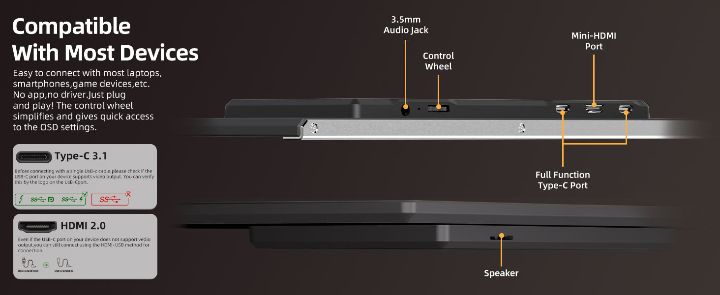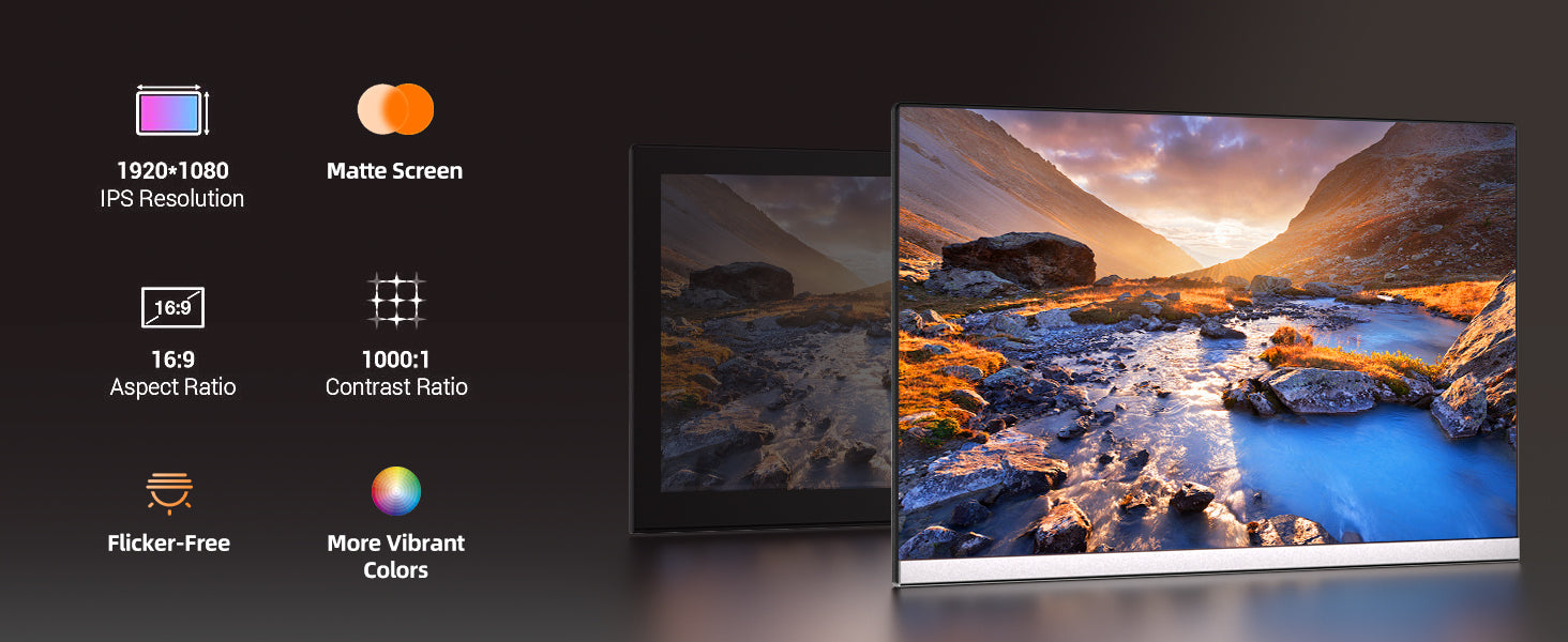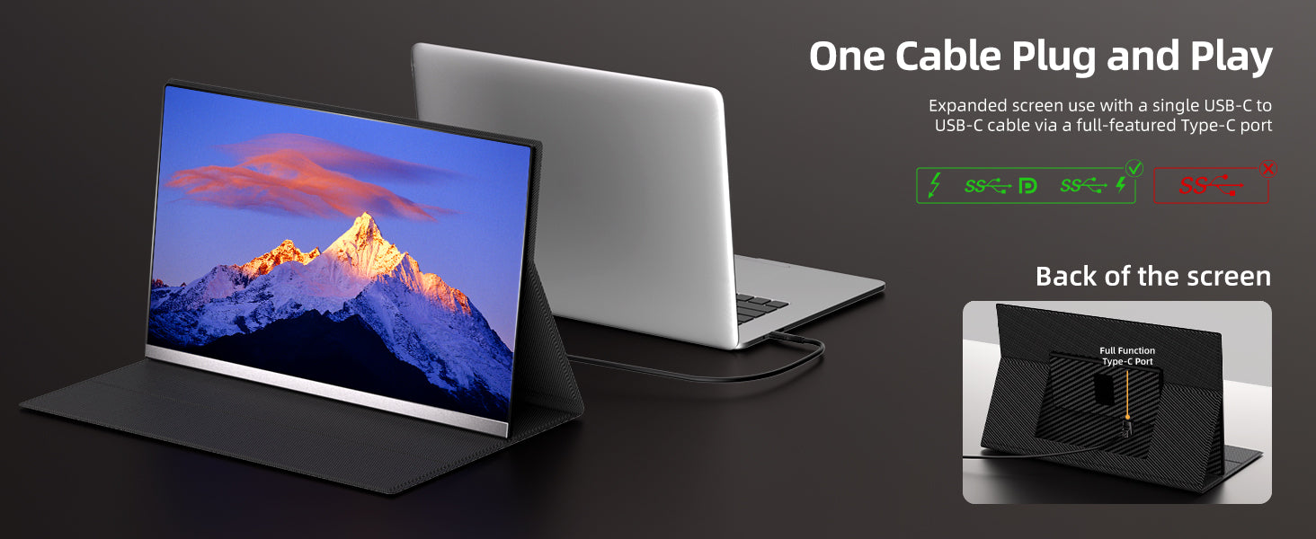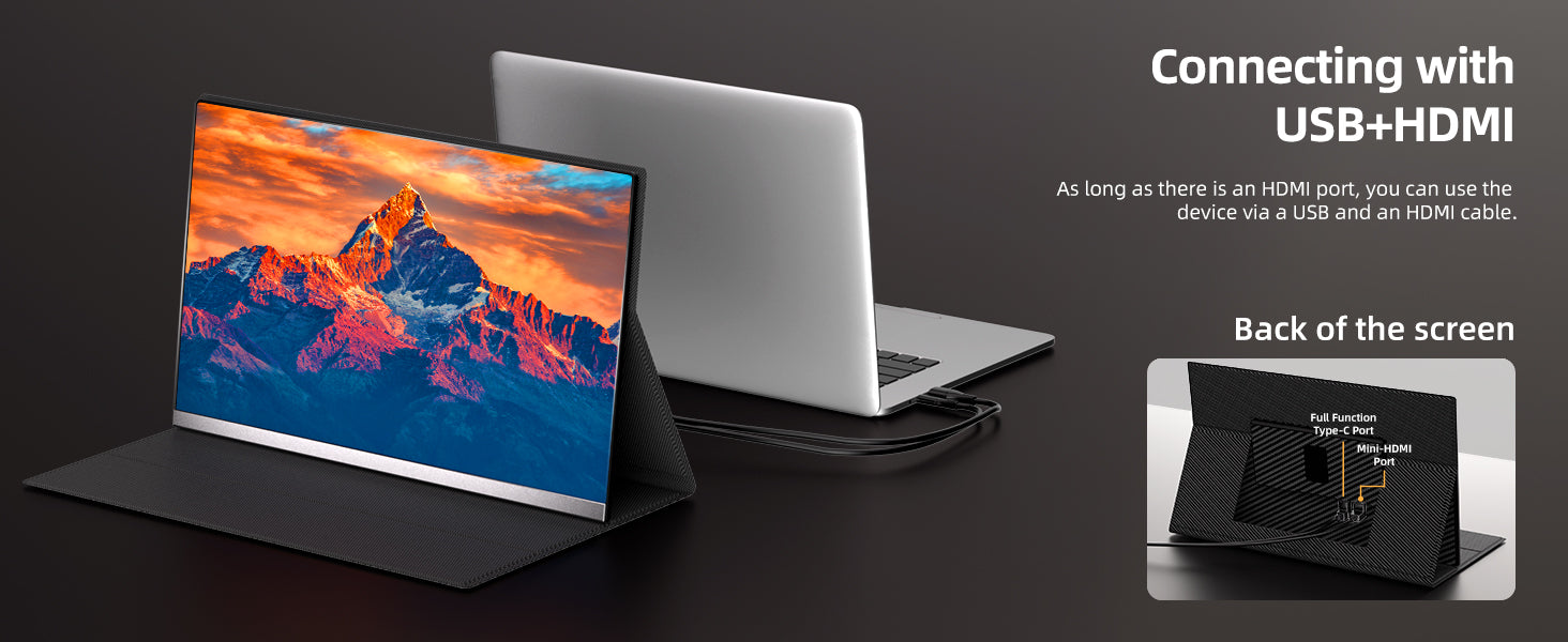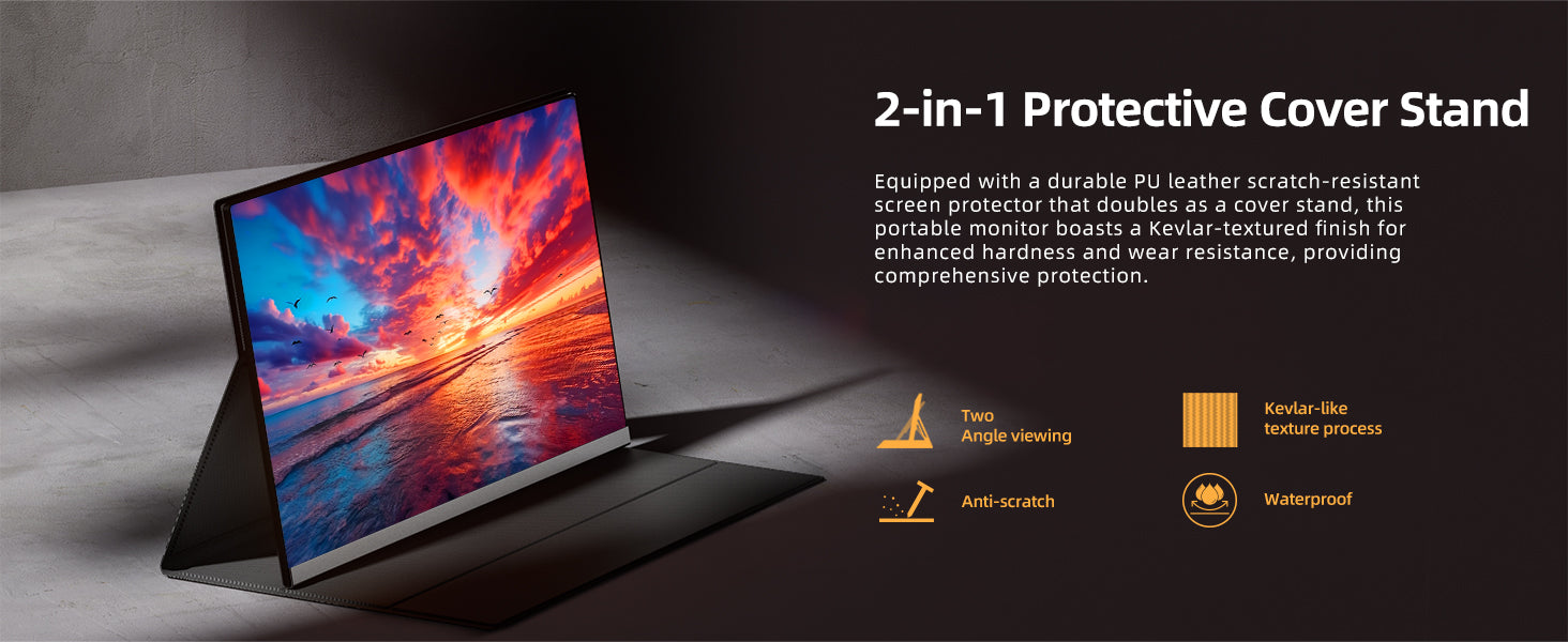Equipped with a anti-scratch screen cover made from durable PU leather.The exterior features a Kevlar-like texture process, which is harder and more wear-resistant, providing comprehensive protection for portable external laptop monitor.Equipped with a non-detachable, non-magnetic stand supports two levels of horizontal adjustment, ensuring stability and ease of use for a comfortable viewing experience.
