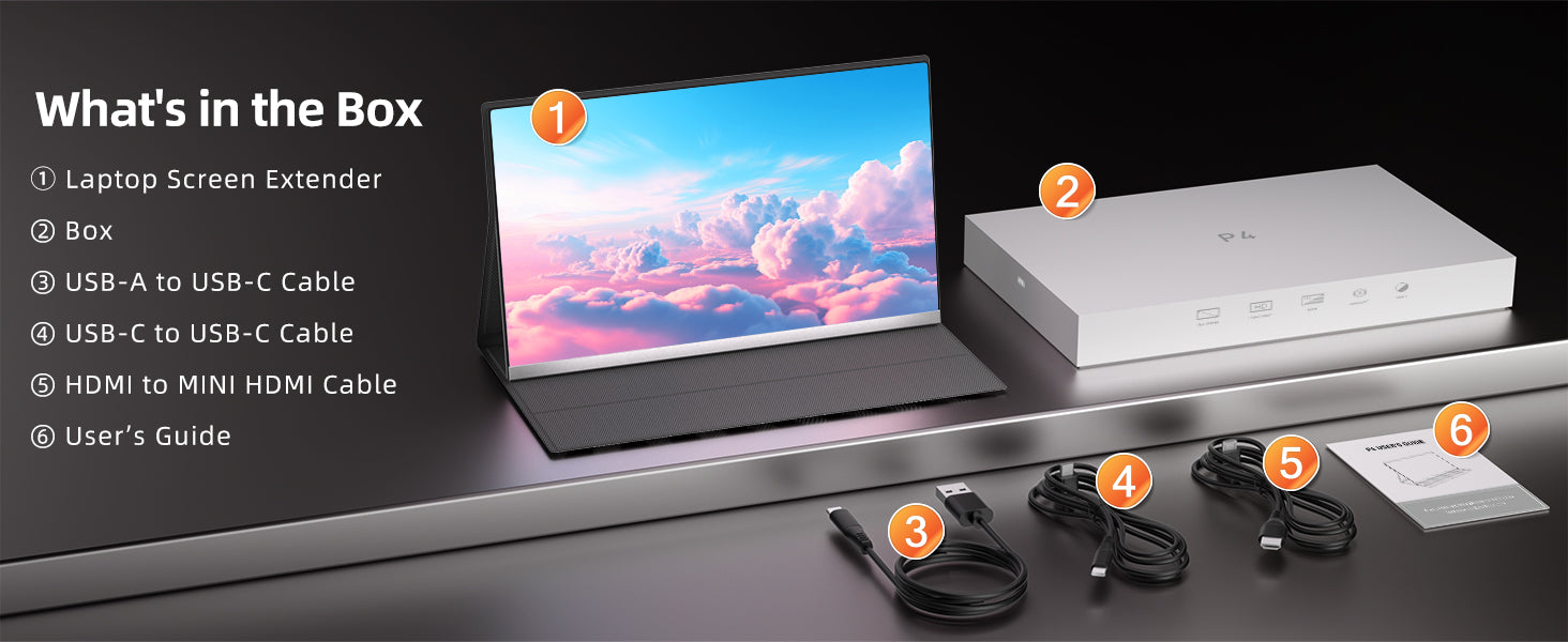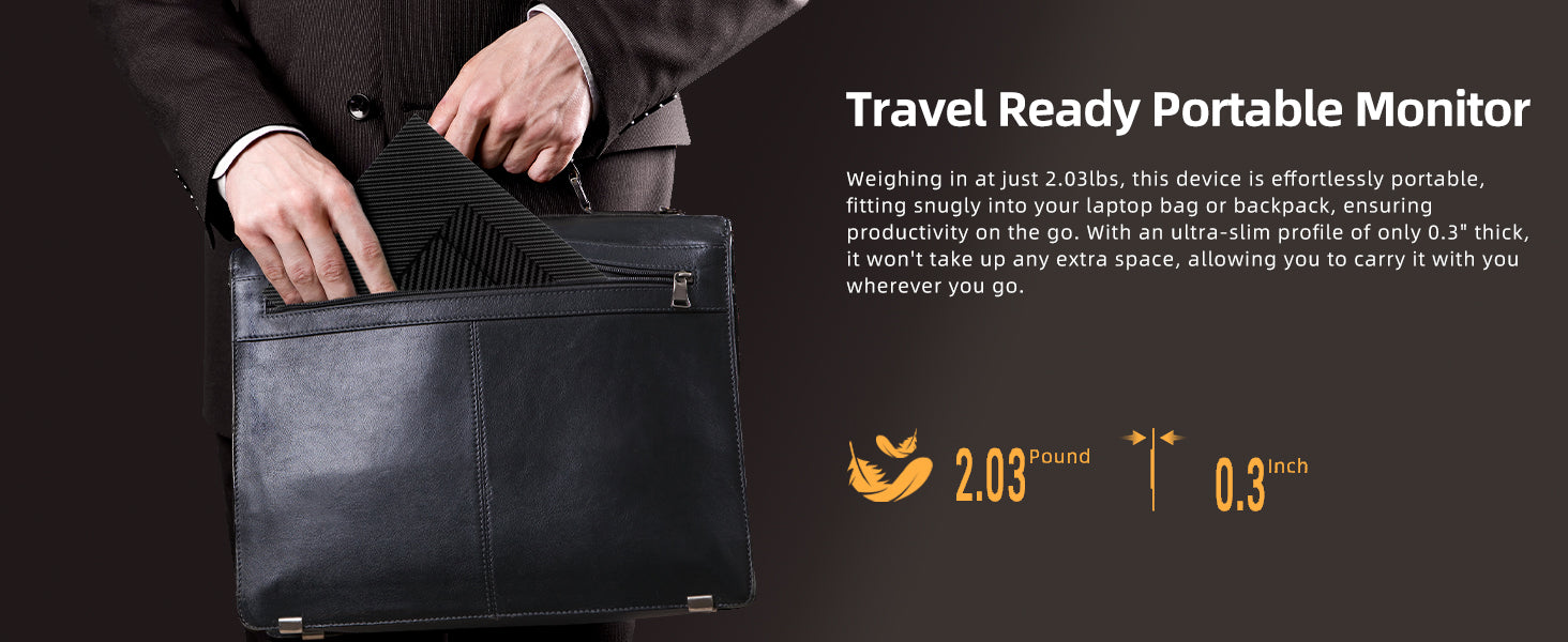 The portable dual-screen monitor is especially designed for business trips and travel. With a weight of only 2.03lbs, you can carry it with you wherever you go. The side screen is just 0.3 inches thick, allowing you to easily slip it into your backpack. Even in parks, cafes, or airports, it can enhance your work efficiency.We offer a 365 day warranty to protect your use.