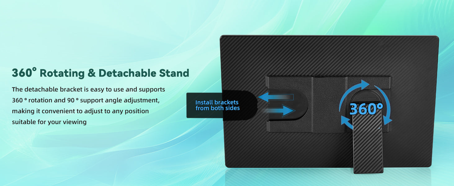 This portable computer screen features a stand that can be tilted up to 90° and rotated a full 360°, giving you the flexibility to position it exactly how you want. With slots on both sides, you can easily switch between horizontal and vertical orientations, making it perfect for everything from spreadsheets to social media. And with three screen modes—Duplicate, Extend, and Second Screen—you can tailor your setup to fit your needs. This monitor is your loyal partner. We offer a 365 day warranty to protect your use.