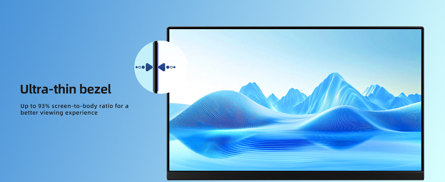 15.6" full-screen, bezel-less laptop screen extender elevate your viewing. Featuring 1080P resolution, 300 nits of brightness, a 1000: 1 contrast ratio, and HDR mode, it offers sharp and vivid visuals. Built-in speaker ensures immersive audio, while low blue light feature minimizes eye strain for longer use. Independent controls for brightness, sound, and contrast give you full command of your viewing experience