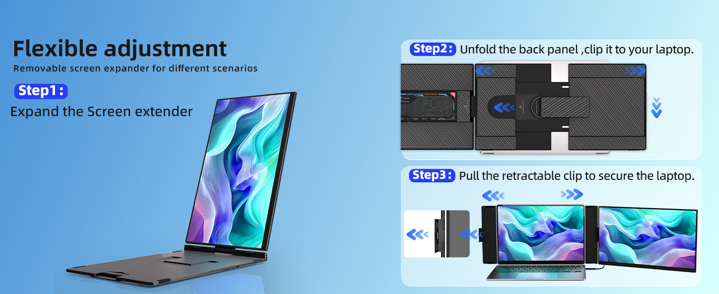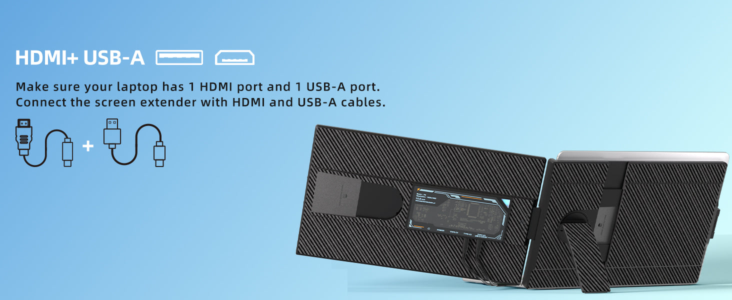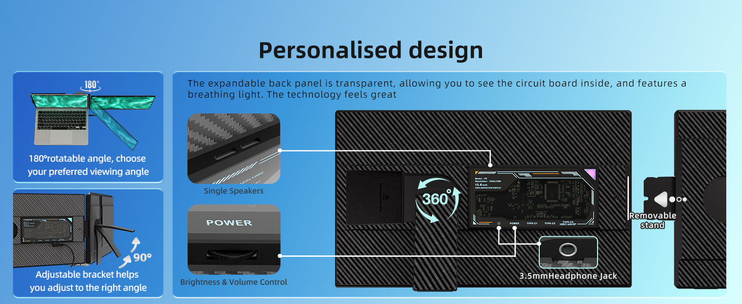 AOKER dual monitor extender presents a sleek, modern design infused with a mechanical aesthetic. Its transparent backplane showcases precisely arranged components, providing a glimpse into its refined engineering. The back panel features a seven-color breathing light for a soft, adding personalization and contemporary style to any workspace. The unique back panel texture makes this screen more aesthetically pleasing and durable