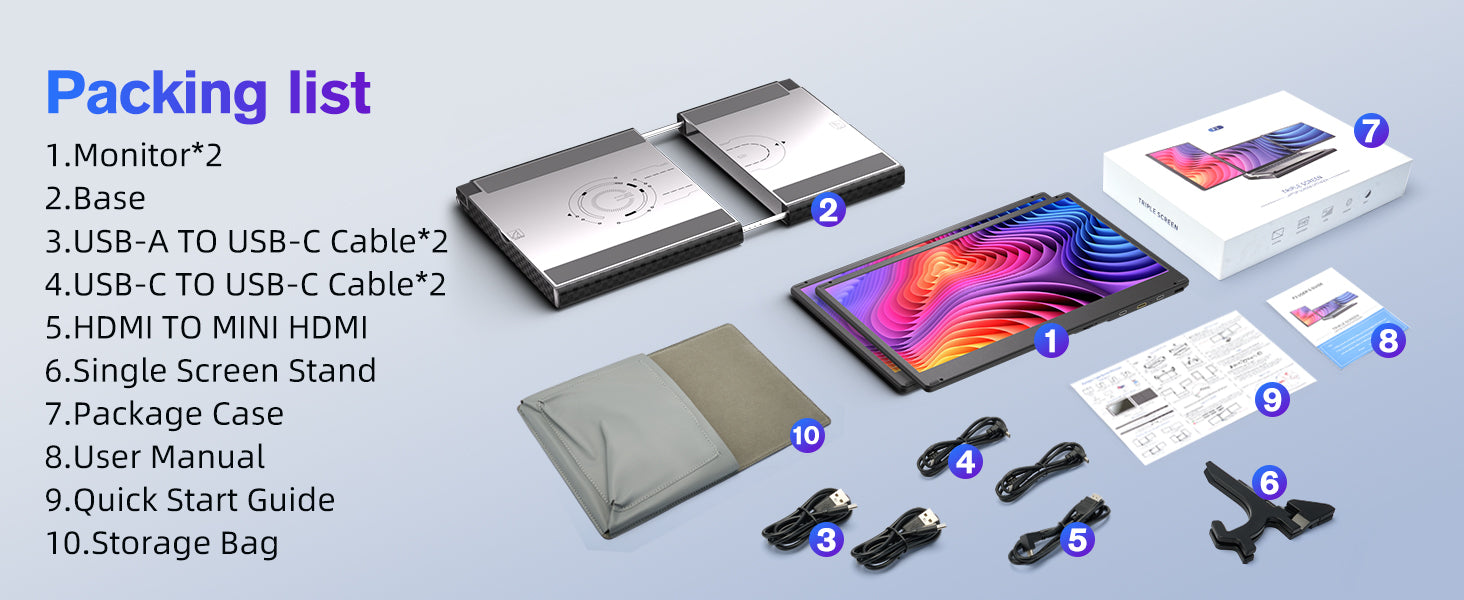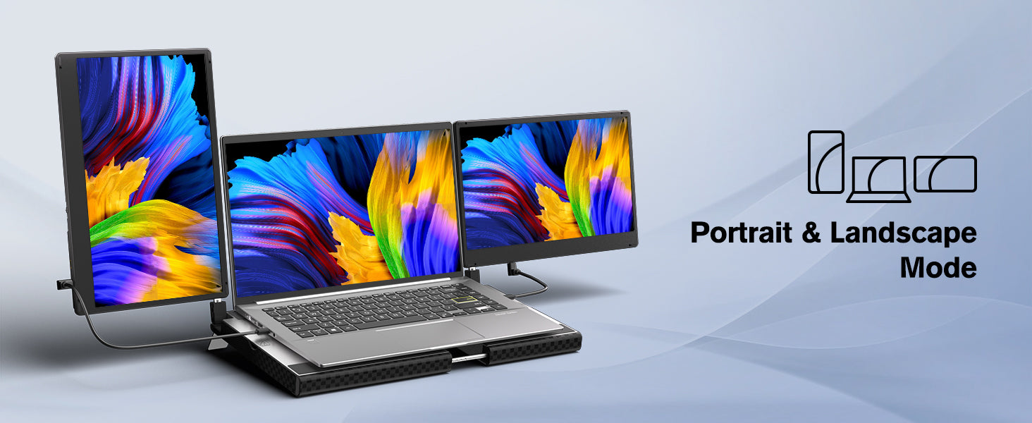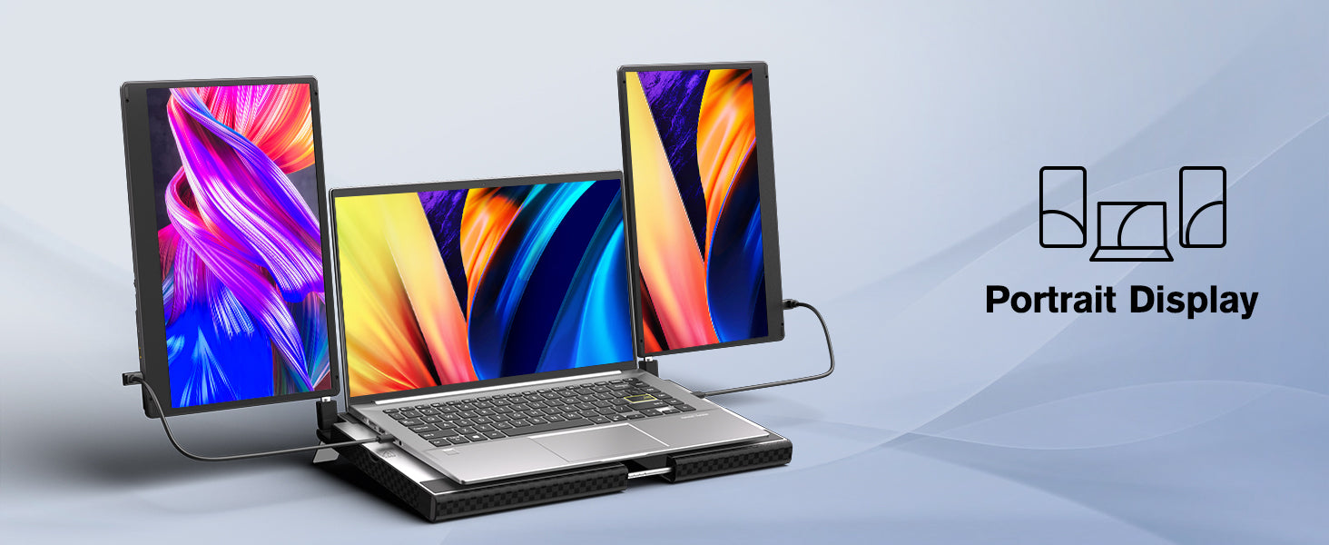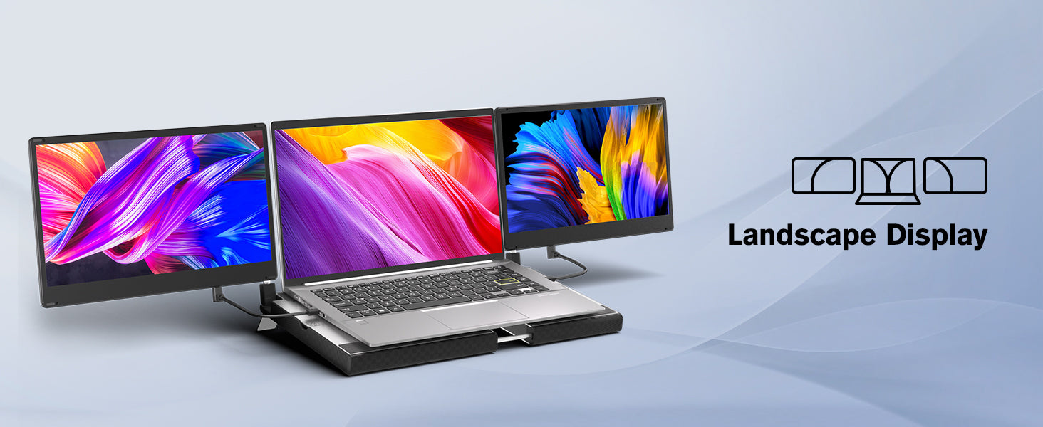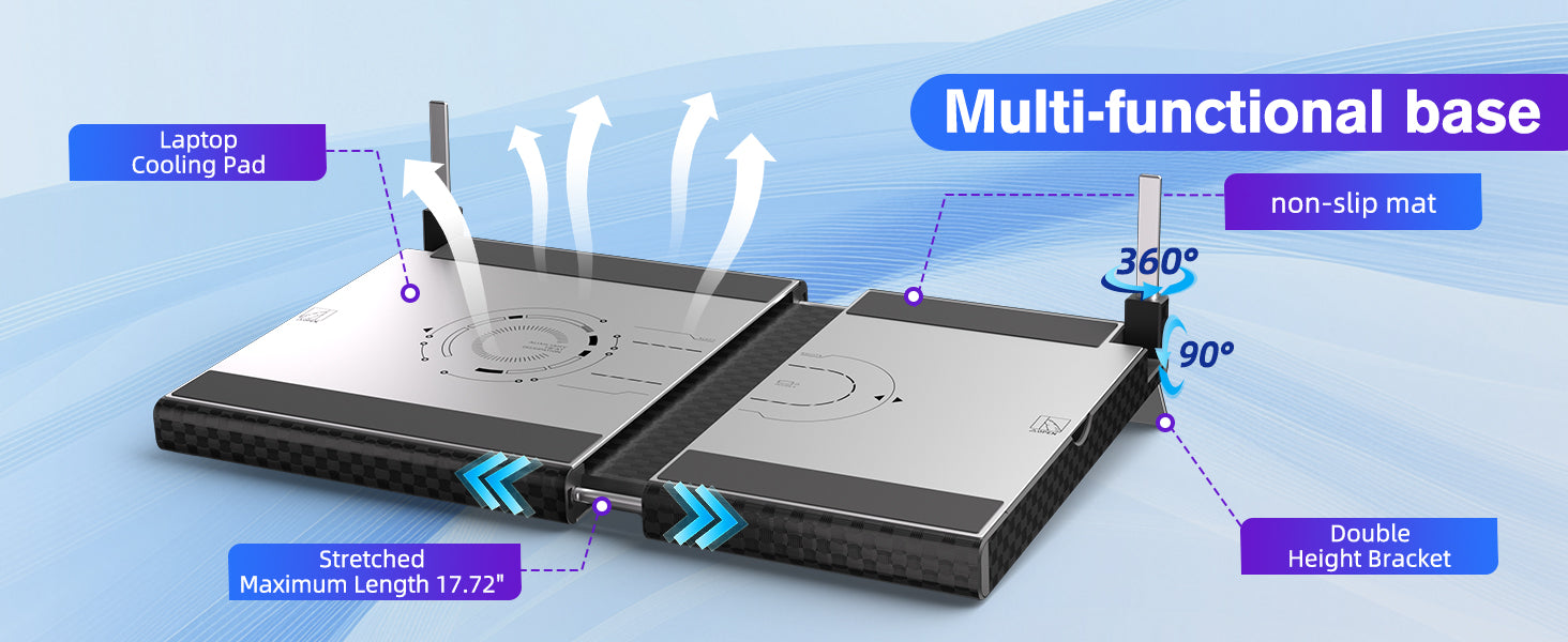 The base of the Laptop Expansion Screen is made of aluminum alloy and is adjustable in length up to 17.72” to accommodate laptops of different sizes. The base is equipped with anti-slip strips and a kickstand, which makes it easy to work while adding anti-slip and stability, and the laptop screen extender's dual screens can be stowed away and placed in the base to keep your desktop neat and tidy.